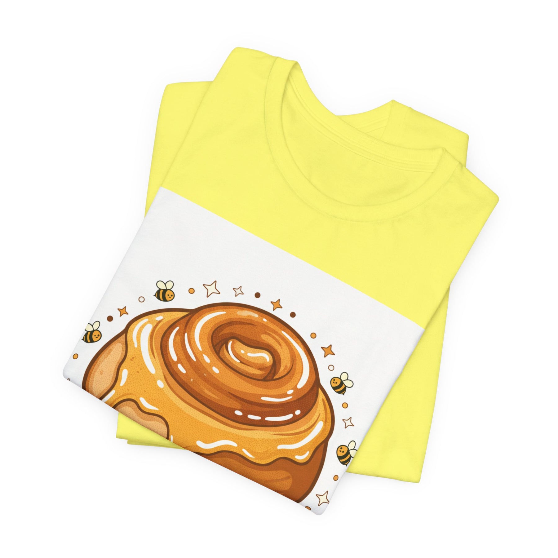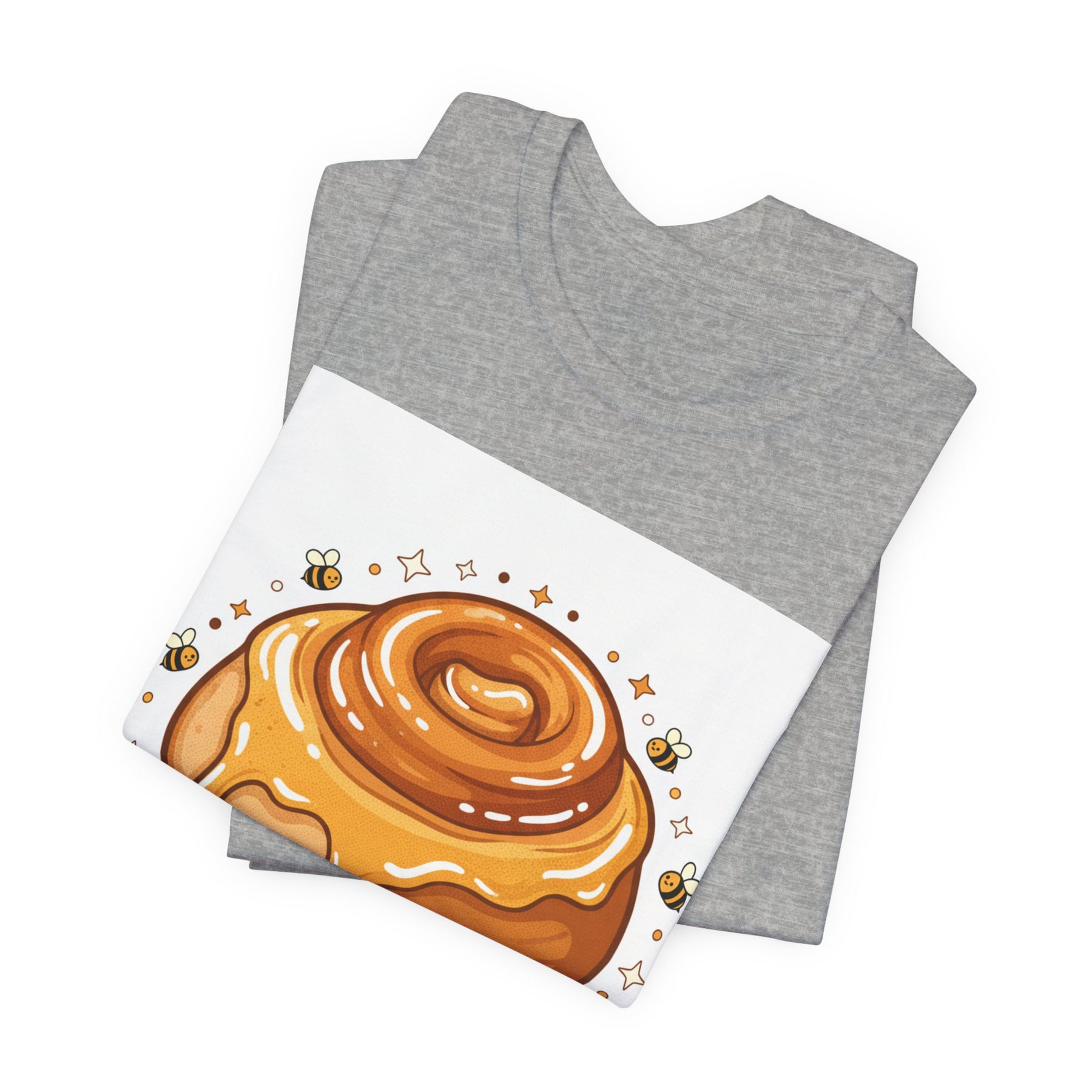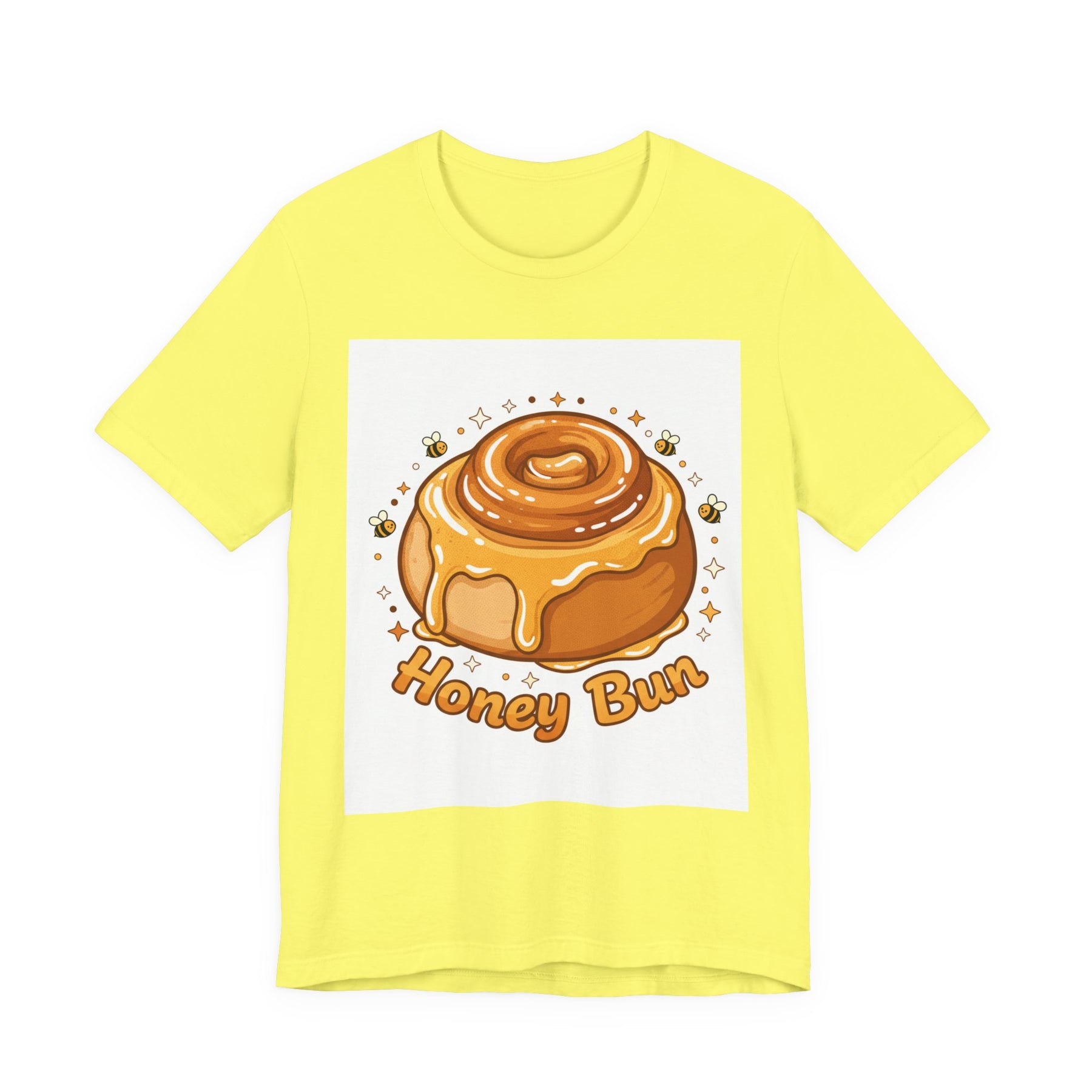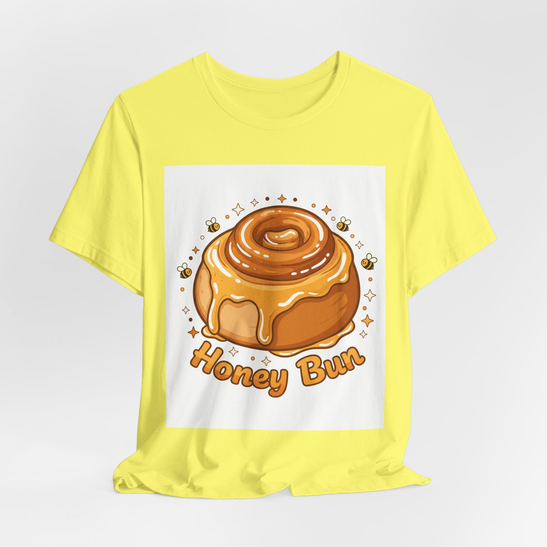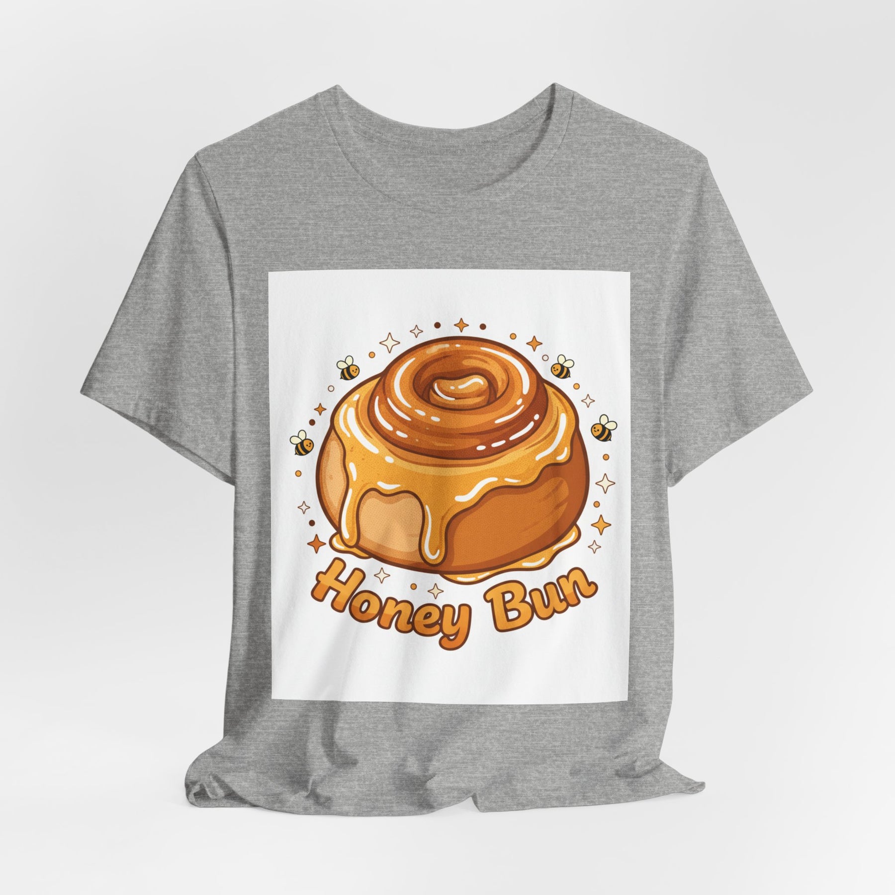 This lightweight, breathable tee brings a warm, cozy vibe to everyday wear. On soft 100% Airlume combed and ring-spun cotton, a glossy illustrated honey bun sits front and center — golden swirls, dripping glaze, and tiny bees create a playful, comforting scene. The retail fit and crew neckline keep the look tidy and easy to layer under jackets or wear solo while running errands, meeting friends, or enjoying a slow weekend morning. Thoughtfully finished with side seams, shoulder tape, and a tear-away label for comfort and durability, it blends sweet charm with practical daily wearability. The design’s cheerful palette pops on light backgrounds, making the tee feel like a small, wearable moment of joy.