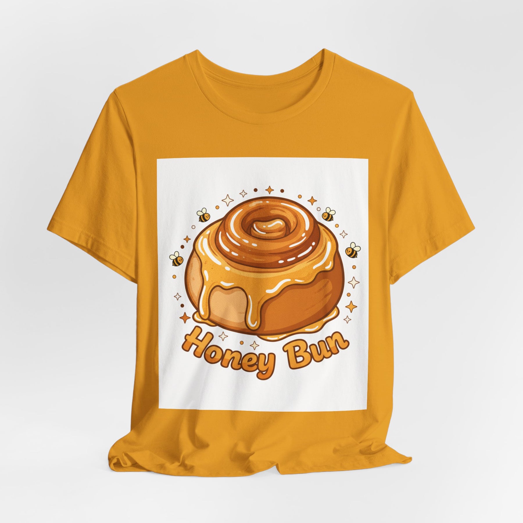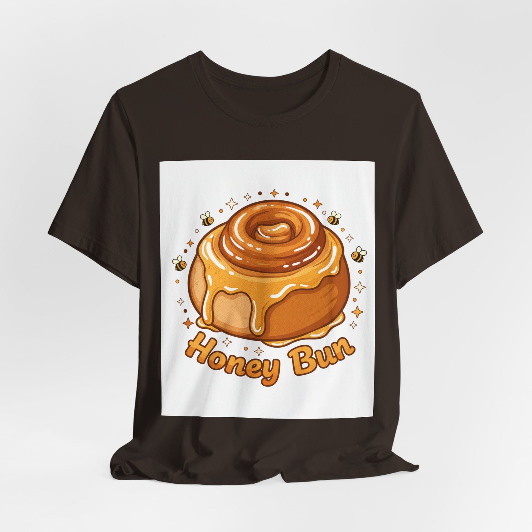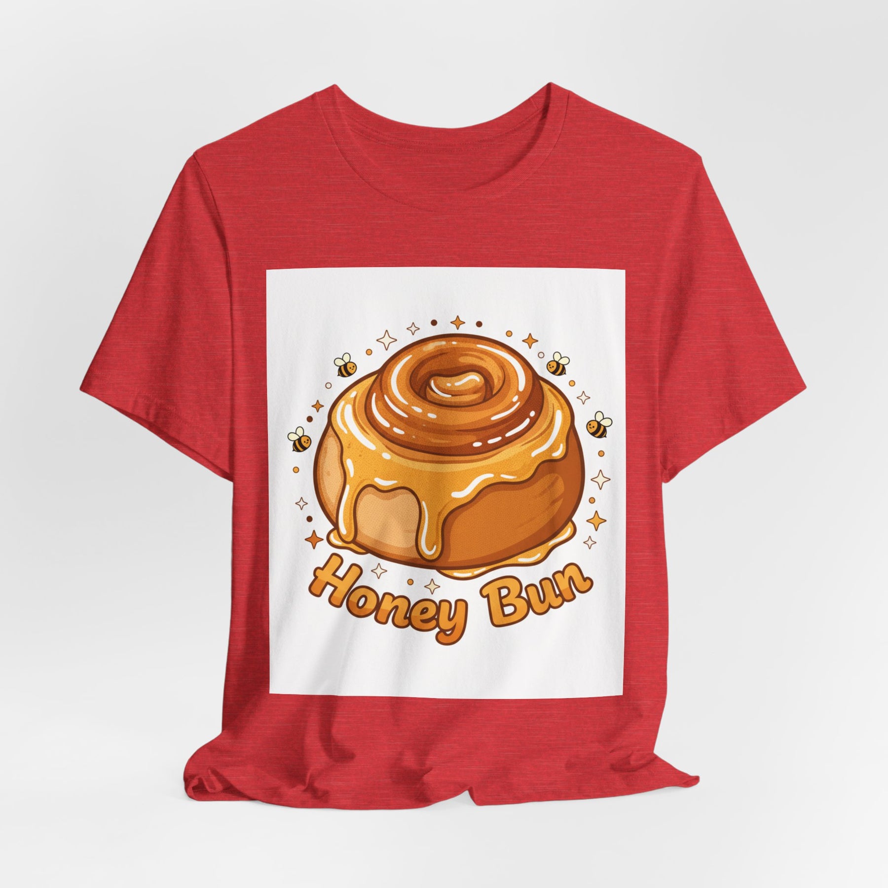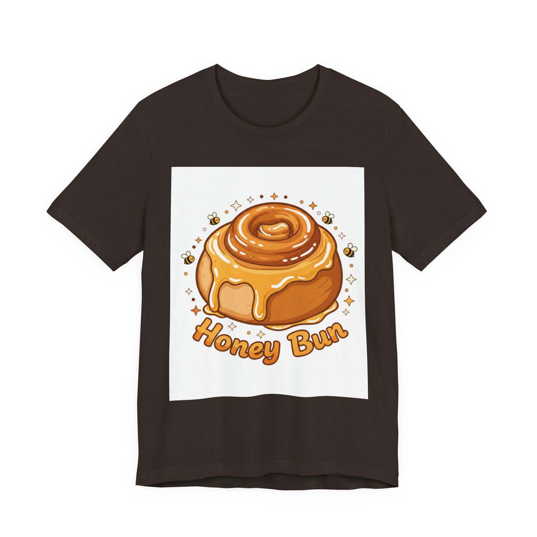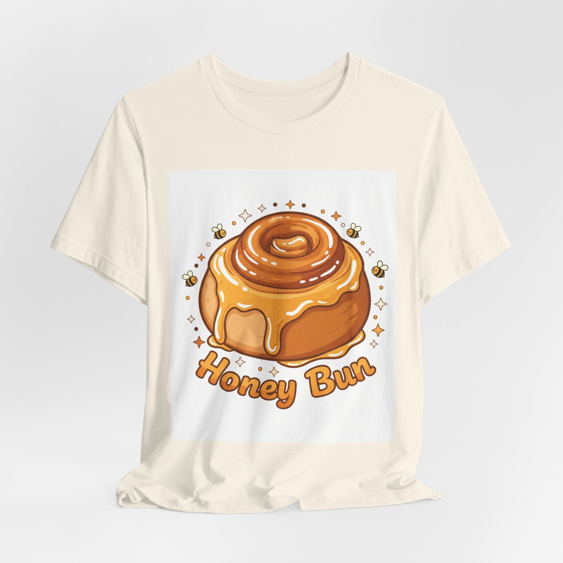 This lightweight, breathable tee brings a warm, cozy vibe to everyday wear. On soft 100% Airlume combed and ring-spun cotton, a glossy illustrated honey bun sits front and center — golden swirls, dripping glaze, and tiny bees create a playful, comforting scene. The retail fit and crew neckline keep the look tidy and easy to layer under jackets or wear solo while running errands, meeting friends, or enjoying a slow weekend morning. Thoughtfully finished with side seams, shoulder tape, and a tear-away label for comfort and durability, it blends sweet charm with practical daily wearability. The design’s cheerful palette pops on light backgrounds, making the tee feel like a small, wearable moment of joy.