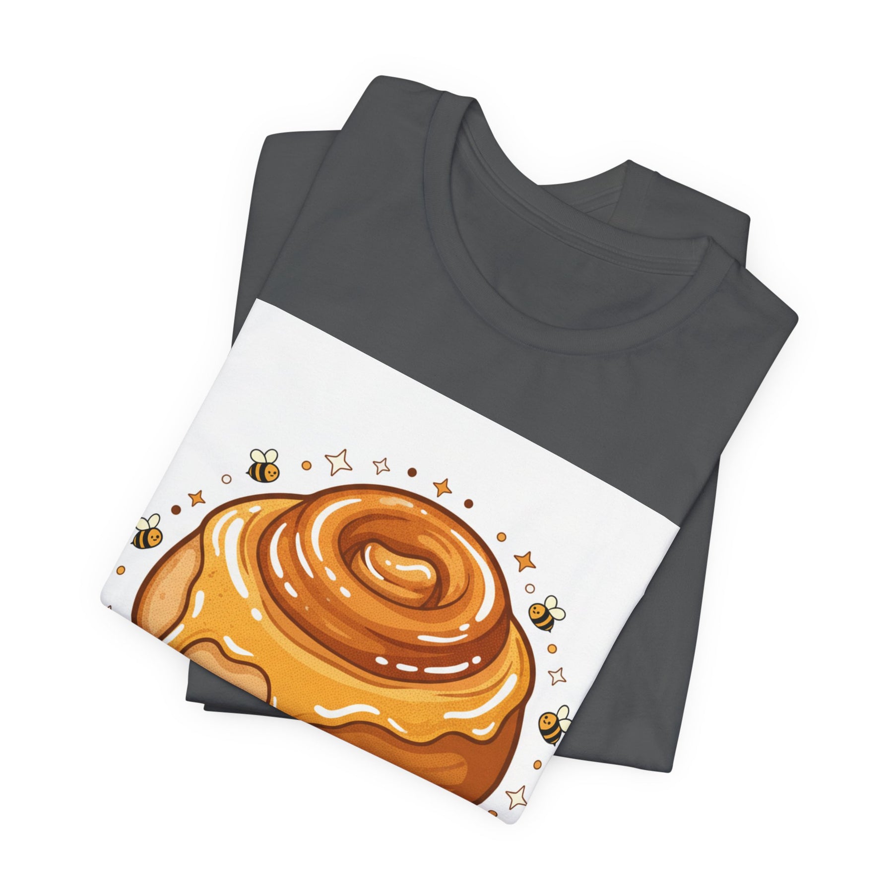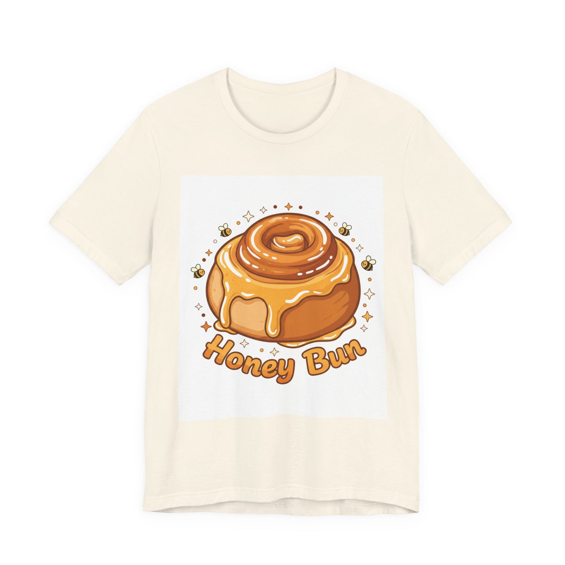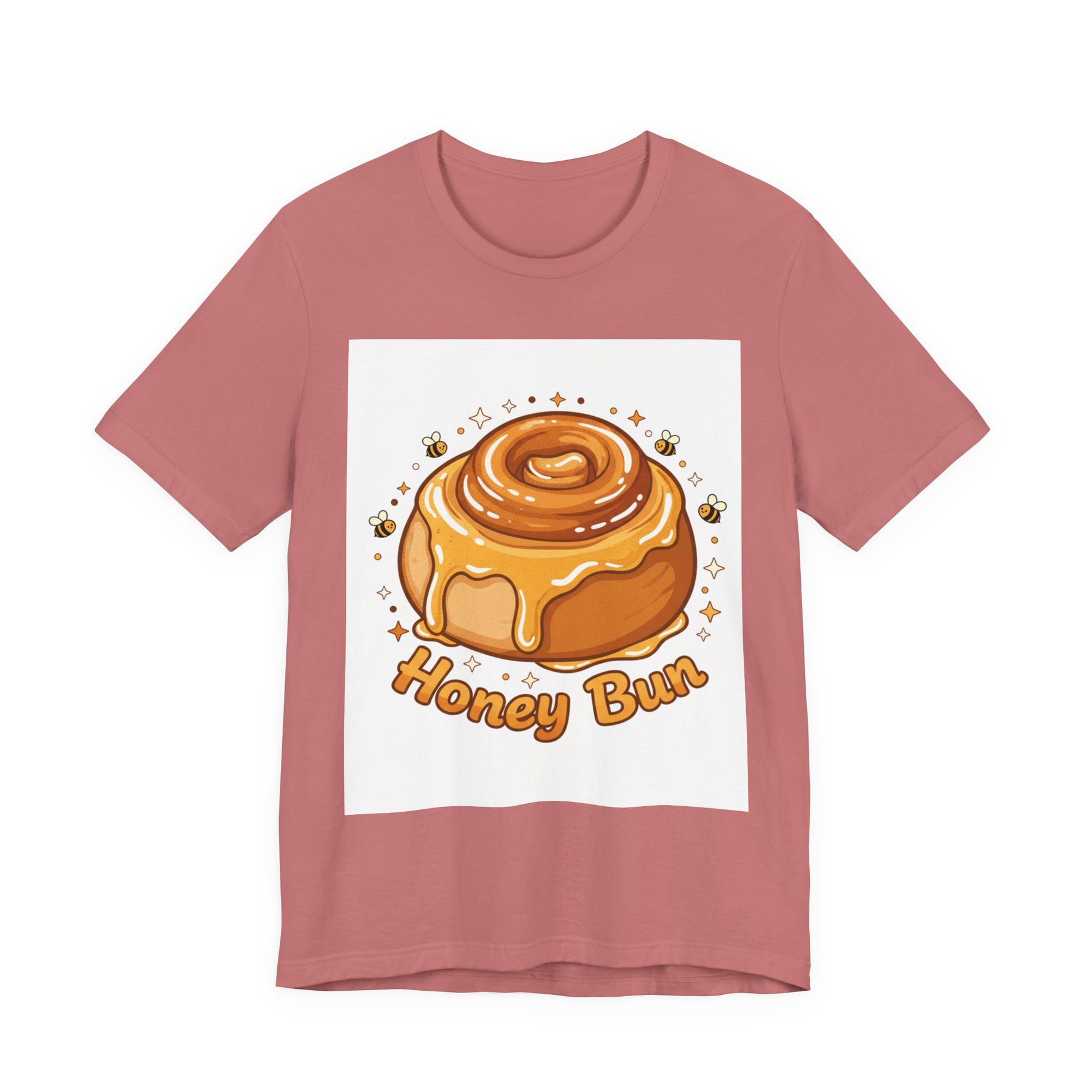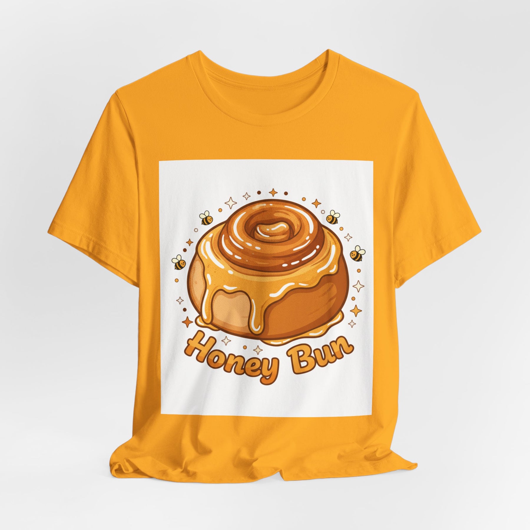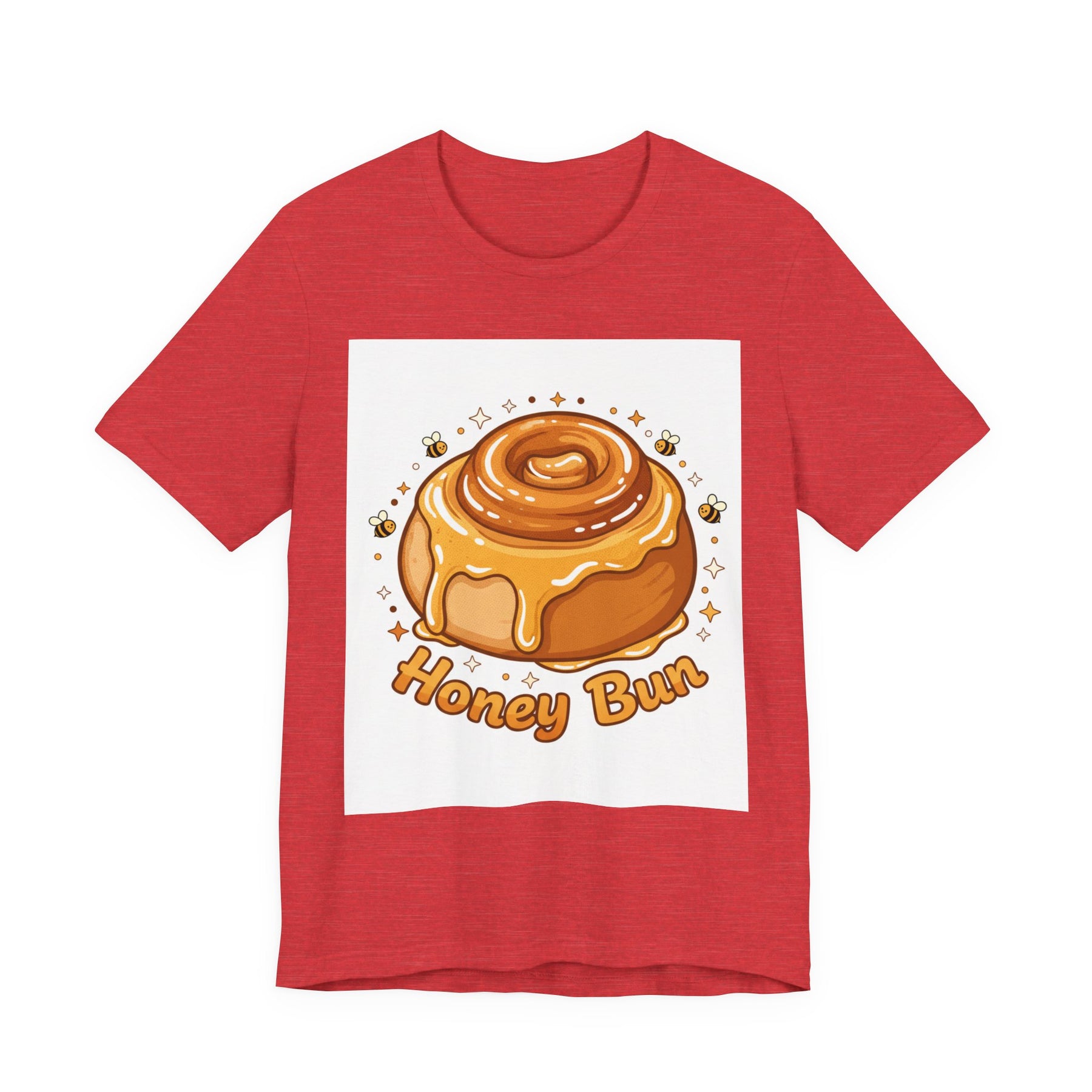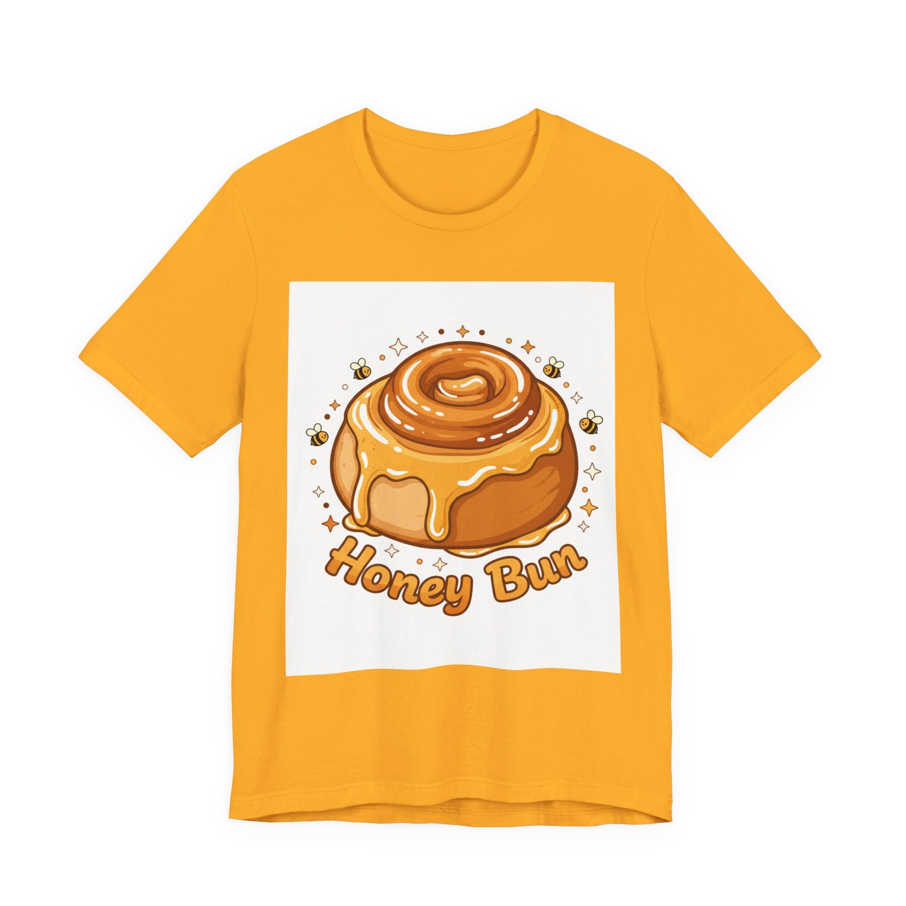 This lightweight, breathable tee brings a warm, cozy vibe to everyday wear. On soft 100% Airlume combed and ring-spun cotton, a glossy illustrated honey bun sits front and center — golden swirls, dripping glaze, and tiny bees create a playful, comforting scene. The retail fit and crew neckline keep the look tidy and easy to layer under jackets or wear solo while running errands, meeting friends, or enjoying a slow weekend morning. Thoughtfully finished with side seams, shoulder tape, and a tear-away label for comfort and durability, it blends sweet charm with practical daily wearability. The design’s cheerful palette pops on light backgrounds, making the tee feel like a small, wearable moment of joy.